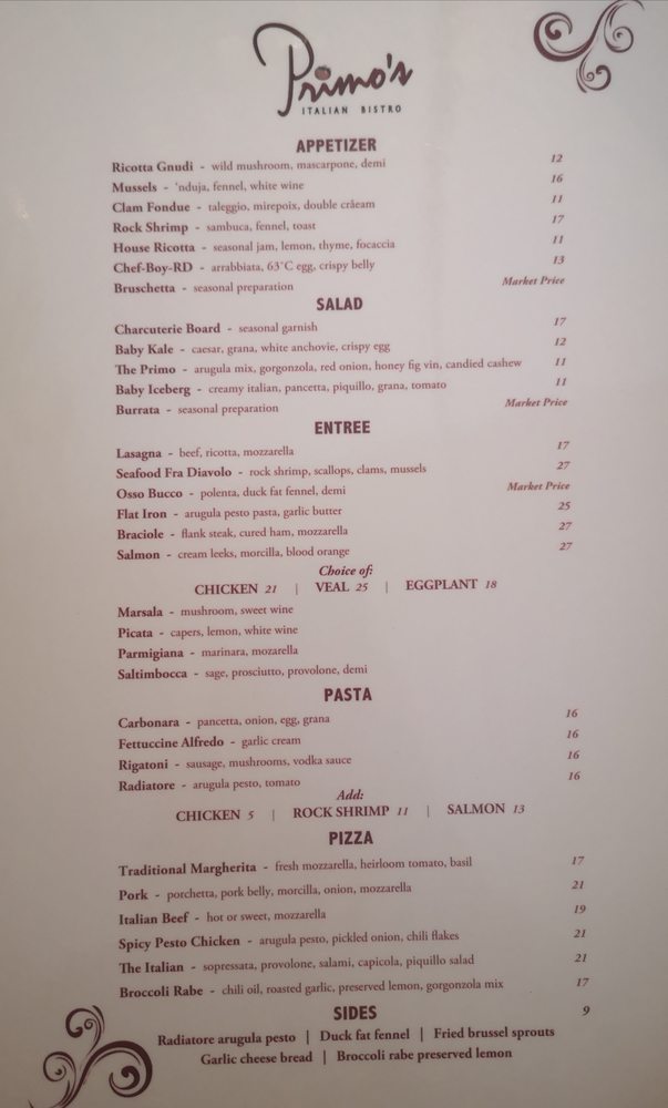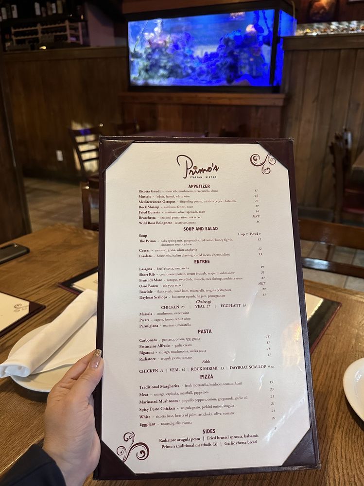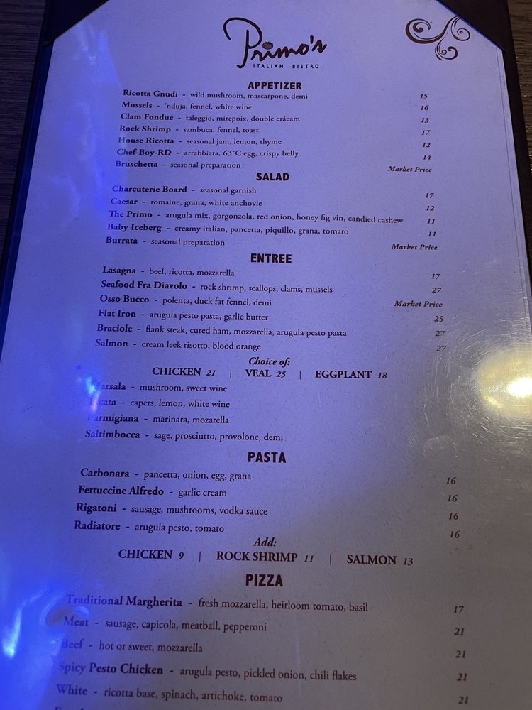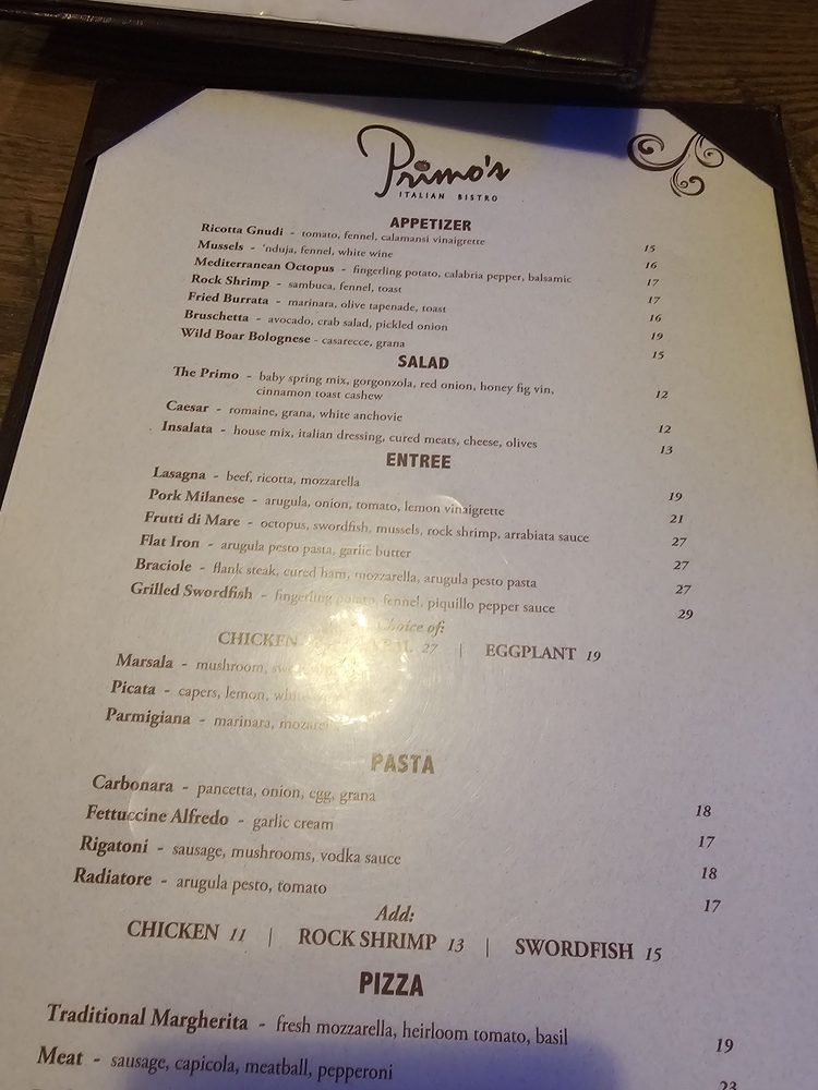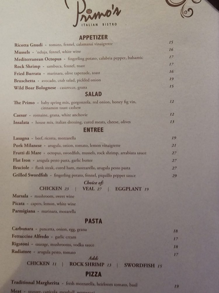 Primo’s Italian Bistro Menu (Update 2025)
