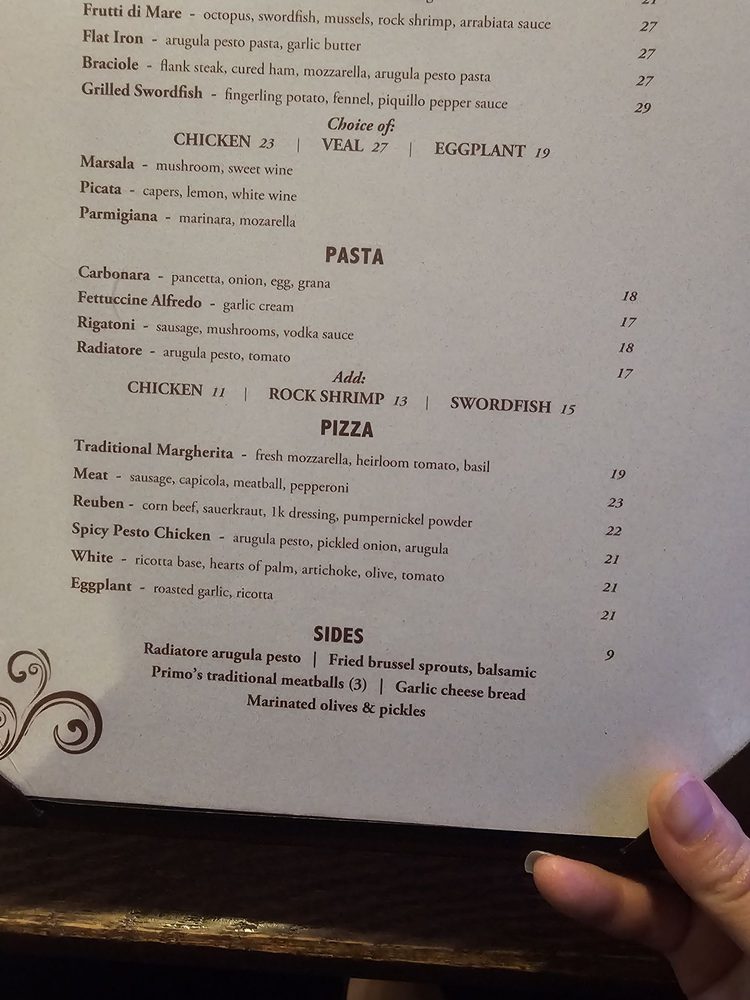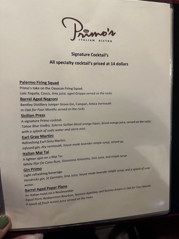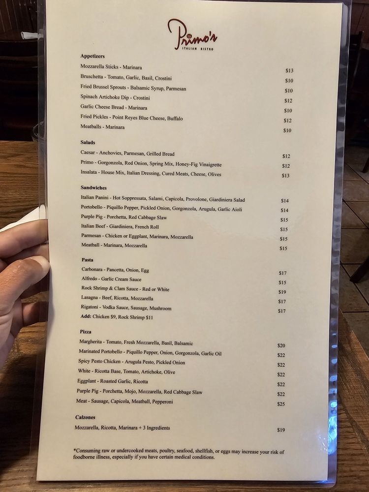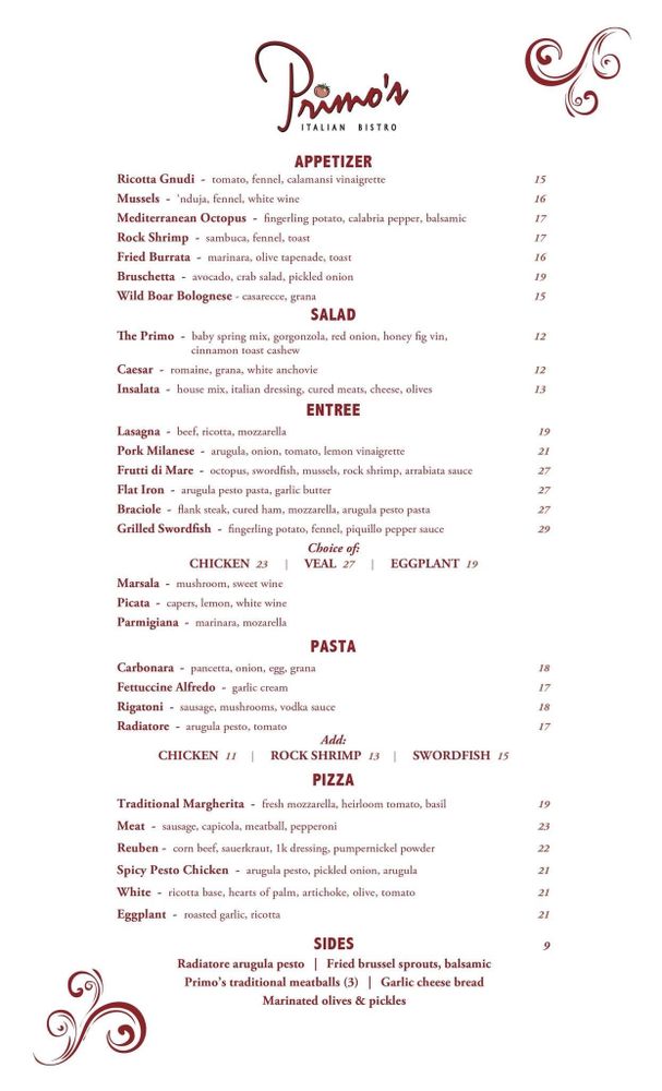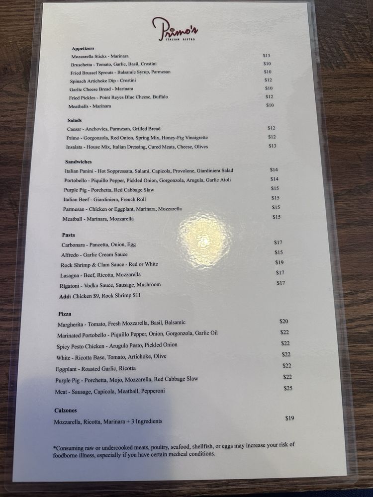 Primo’s Italian Bistro Menu (Update 2025)